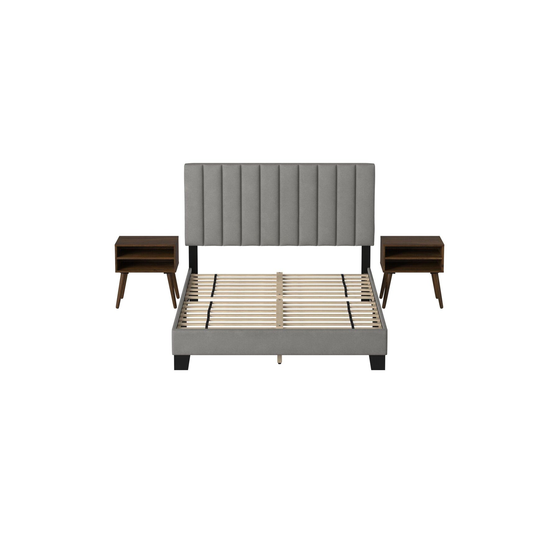 Instantly transform any bedroom with this beautiful, velvet bed. The upholstered headboard features stylish vertical channel tufting that creates a modern or contemporary look. Also keep your bedside essentials in arm's reach with two accompanied mid-century styled nightstands. Bed includes sturdy euro slats, and everything ships in one box for quick and easy setup.