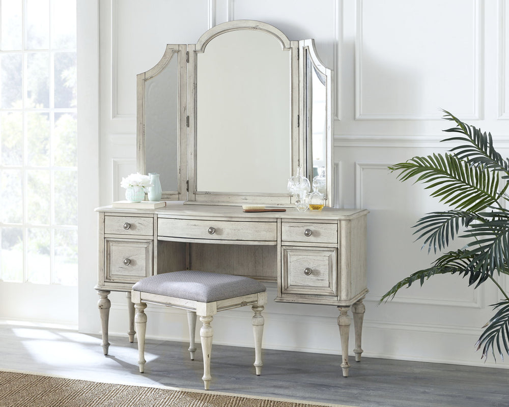Highland Park features vintage styling in a classical bedroom collection. Sturdy construction using hardwood solids and veneers in a distressed rustic finish. Enjoy the vintage farmhouse style vanity that comes complete with gorgeous arched, hinged mirror and comfortable stool with padded fabric seat. Five drawers for convenient storage are accented by soft pewter knobs and beautifully turned legs.