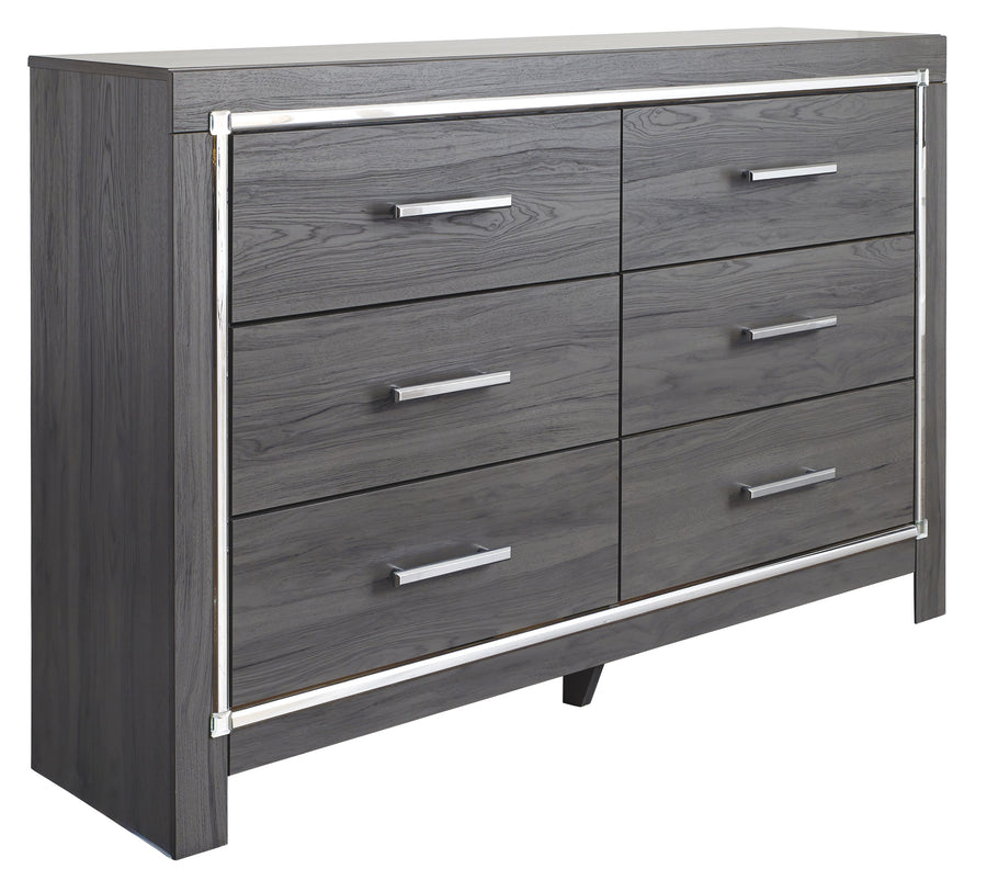 Modern gray finish with replicated wood grain. Cases and bed are accented with faceted chrome details. Large scaled chrome handle with faceted details. Headboards are accented with LED lighting and include a remote for color and brightness options. Included remote holder discreetly keeps light remote accessible. Headboards are accented with faux crystal tufted black upholstery. Side roller glides for smooth operating drawers. Drawer interiors are lined with a faux linen laminate for a clean finished look. Both king and queen panel beds have a panel footboard (54,56) and storage footboard option (54S, 56S). Queen (57) and king (58) headboards can attach to a bolt-on metal bed B100-31 or B100-66 respectively. Both USB and Qi wireless charging options are provided with the night stand. Queen (54, 54S) and king (56, 56S) can use -95 platform rails and require B100-13 (queen) or B100-14 (king) roll slats eliminating the need for a box spring. Safety is a top priority, clothing storage units are designed to meet the most current standard for stability, ASTM F 2057 (ASTM International). Drawers extend out to accommodate maximum access to drawer interior while maintaining safety.