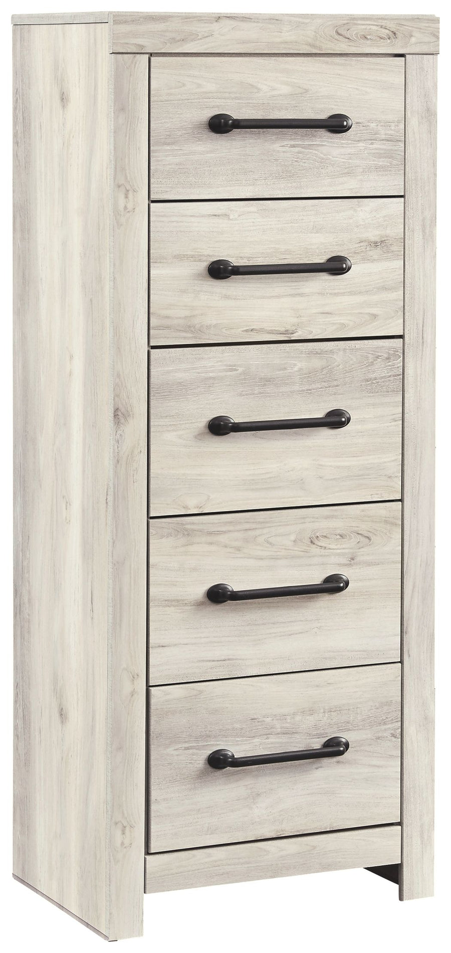 What a delightful take on rustic industrial style. Whether modern loft or modern farmhouse, this narrow chest makes itself at home. The wispy whitewash palette enhances without covering the grain for that weathered look you crave. Designed to accommodate smaller spaces, its linear profile and modern handles are a refreshing change of pace.