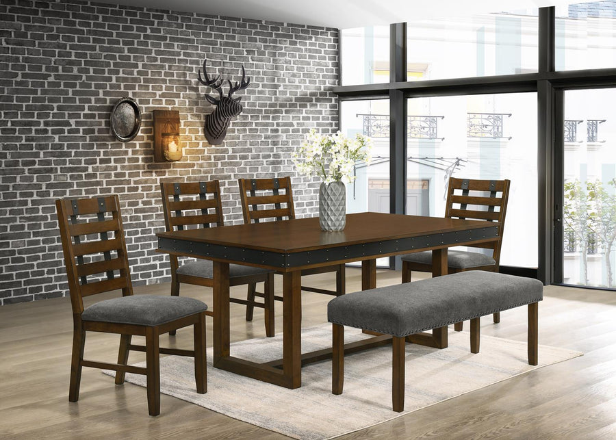 - Wood with antiqued brush oak finish, black accents with nail head trim, trestle base table. Grey fabric upholstered seats.