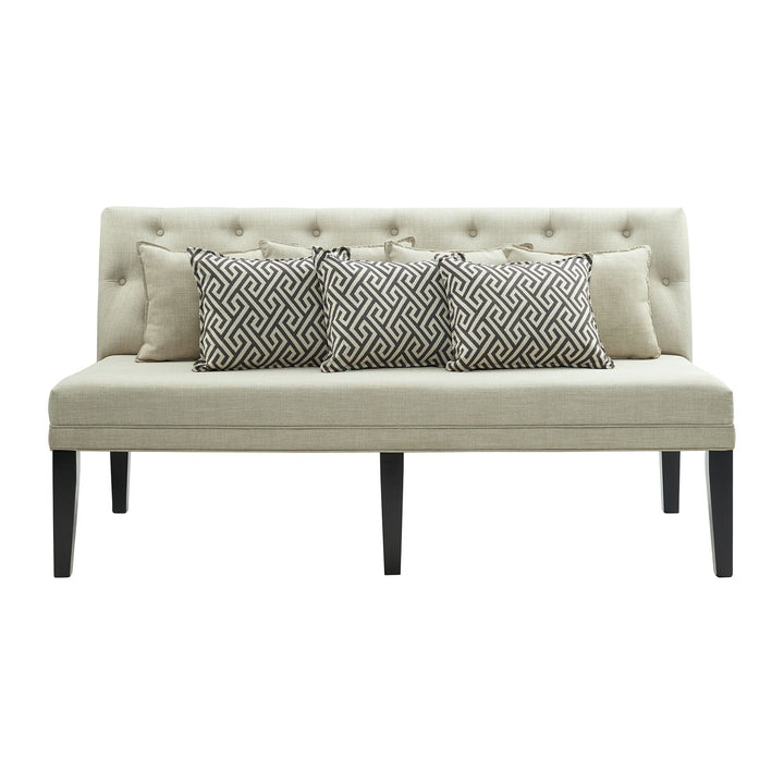 The Maddox Dining Sofa with Seven Pillows takes dining seating to the next level. This piece is fully upholstered in taupe fabric. Four taupe pillows and three grey decorative pillows with geometric designs accent this piece. Button tufting along the back adds extra flair to this already stunning piece. No need to worry about comfortability, as this sofa has foam cushion for the back and seat. Not to mention, the dark wire brush finish of the legs gives great contrast with the taupe fabric. This sofa seats three comfortably. Add this sofa to the dining table in this collection for a perfect pairing.