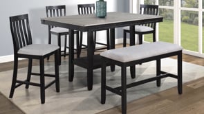 This counter-height dining group marries modern sophistication with casual dining. The ensemble includes a robust table in a 2 toned finish that brings a bold statement to your dining space. The clean lines and solid construction reflect contemporary design trends, while the high-back chairs and spacious bench boast a complementary gray upholstery, adding a touch of refined comfort. The bench option introduces a versatile seating choice, perfect for family gatherings.