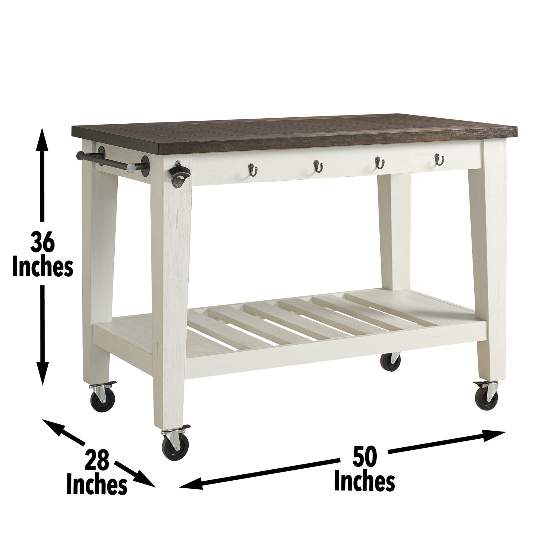 The Cayla kitchen cart offers style and convenience to your kitchen or dining area. The farmhouse style cart is crafted of durable hardwood solids and acacia veneers in a two-tone finish with antiqued white base and dark oak finish tops. Four hooks keep towels and pot holders handy and the large second shelf is perfect for storing pots and pans while the casters provide mobility. Features also include a towel bar on each end. A must-have for your kitchen space.