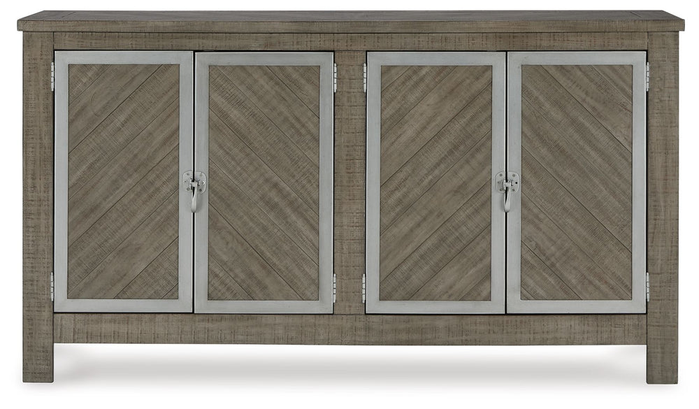 The use of mixed materials on this urban-inspired double buffet makes it a true statement piece. Made of wood with metal accents, this buffet features two spacious cabinets, each with an adjustable shelf and metal framed doors with trend-right window latches. A complex blend of stains and glaze create a weathered gray finish for a relaxed and harmonious update to your home.