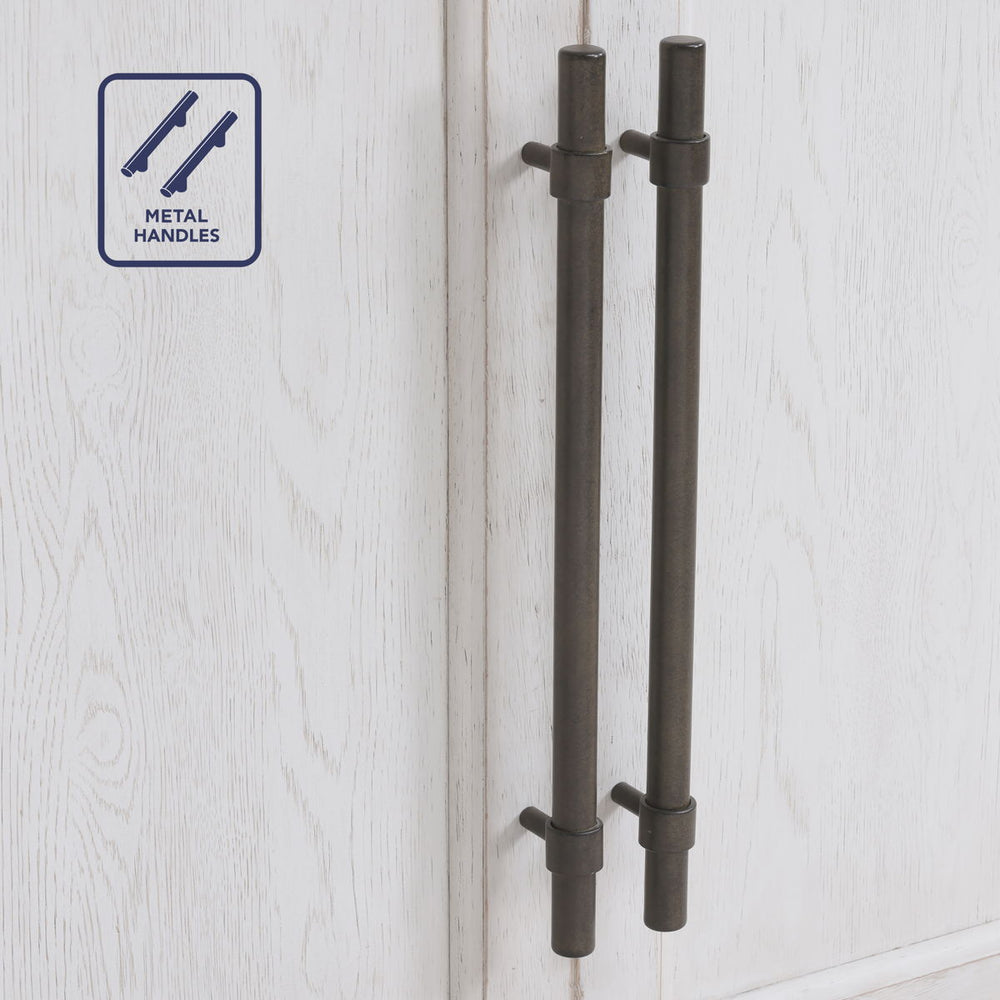 Clean lines meet thoughtful details in the Warren 60" Server. Timeless, yet modern, this Server features heavy molding, a plinth base, and picture frame doors adorned with oversized oil-rubbed brass hardware pulls, for a look that exudes sophistication. A distressed white finish with worn edges adds character to the piece, reflecting years of loving care. With three doors showcasing beautiful frontage, discover ample storage space behind, complete with two adjustable shelves for your dining essentials. Versatile enough for the dining room, hallway, or home office, the Warren Server seamlessly combines style with functionality for any space.
