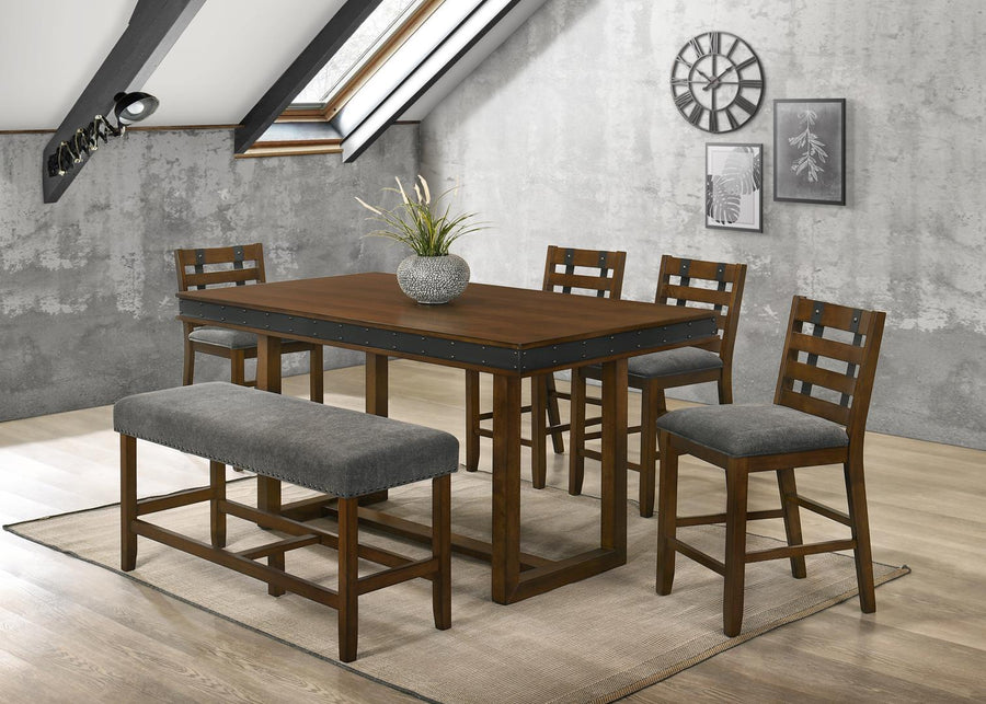 - Wood with antiqued brush oak finish, black accents with nail head trim, trestle base table. Grey fabric upholstered seats.