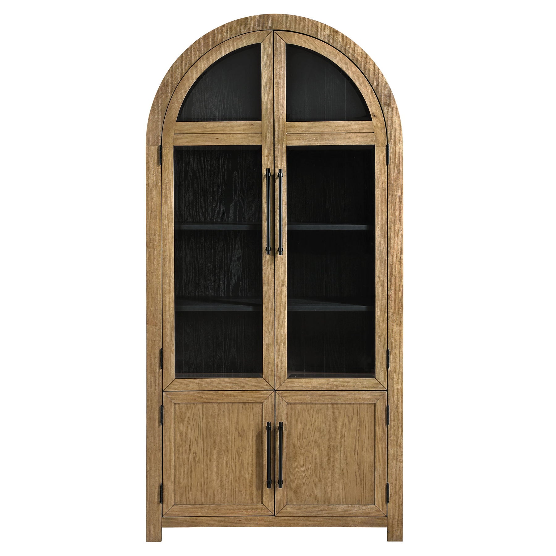 The Magnolia Curio, with a weathered sand interior, adds elegance to any room. Its domed top and upper dual glass doors create a stunning display for china, collectibles, or décor, while lower dual doors provide hidden storage.