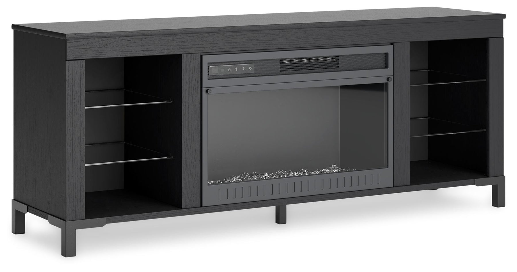- Fireplace insert and shelves feature color and brightness controlled LED lighting