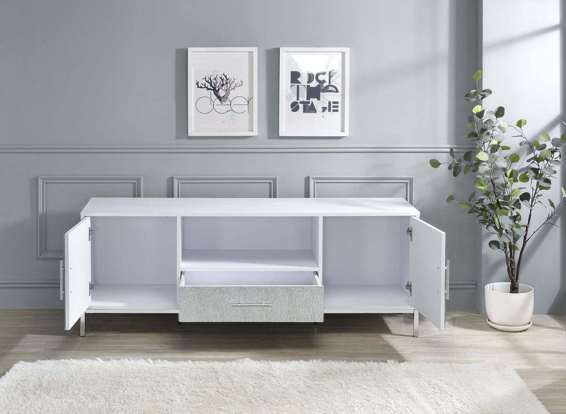 Dazzling and entertaining, the Mirage TV Cabinet makes a beautiful focal point to any room. Glam styling and generous storage combine with a white finish, mirrored drawer fronts and chrome legs in a cabinet that will sparkle with any available light. An open electronic cubby, two doors and a drawer provide ample space for all devices. white incorporated wire management system keeps wires organized.
