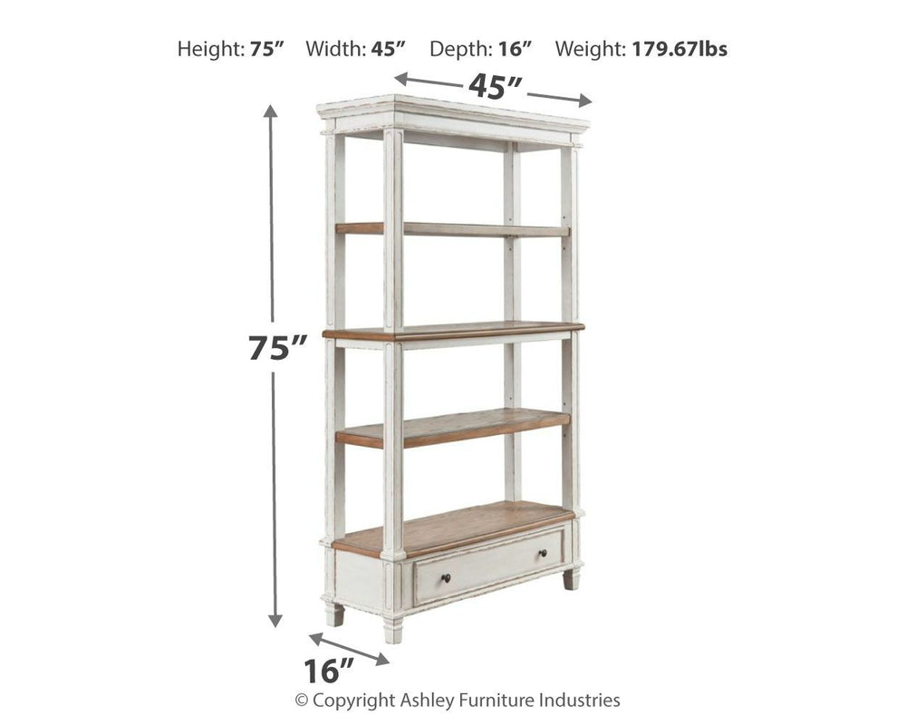 Elevating the art of traditional cottage styling, this bookcase is your heavenly home office realized. Its antiqued two-tone aesthetic blends a chipped white with a distressed wood tone top for added charm. The bookcase’s clever balance of shelf and drawer space beautifully works.