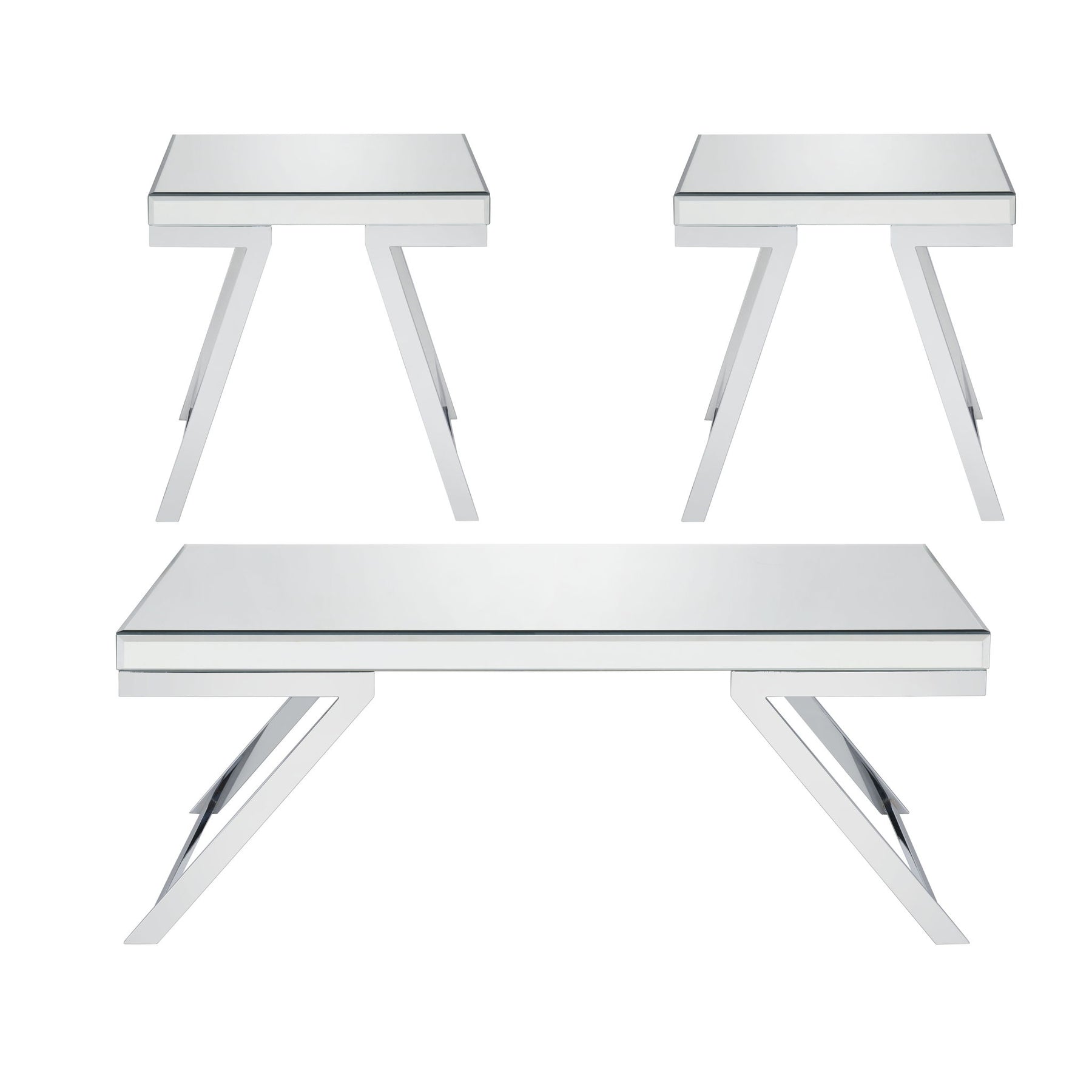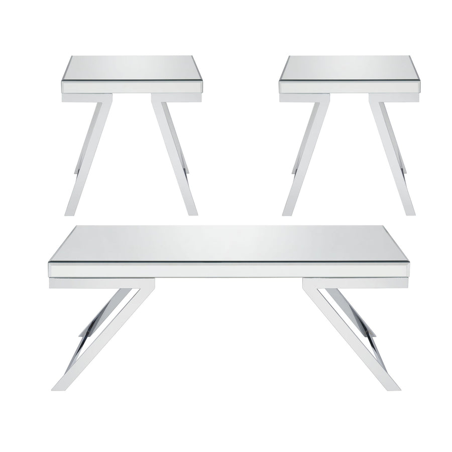 The Alfresco Table Set features a glistening chrome base and a reflective beveled mirror top in a table that adds sparkle to any room. Mid-Century Modern styling gets a glam update in this stunning set of Living Room accessories. Light and airy but yet substantial, these tables are naturally a reflection of their surroundings with the stunning tops. This set comes with a Coffee Table and two End Tables to set up a living area immediately with instant sparkle!
