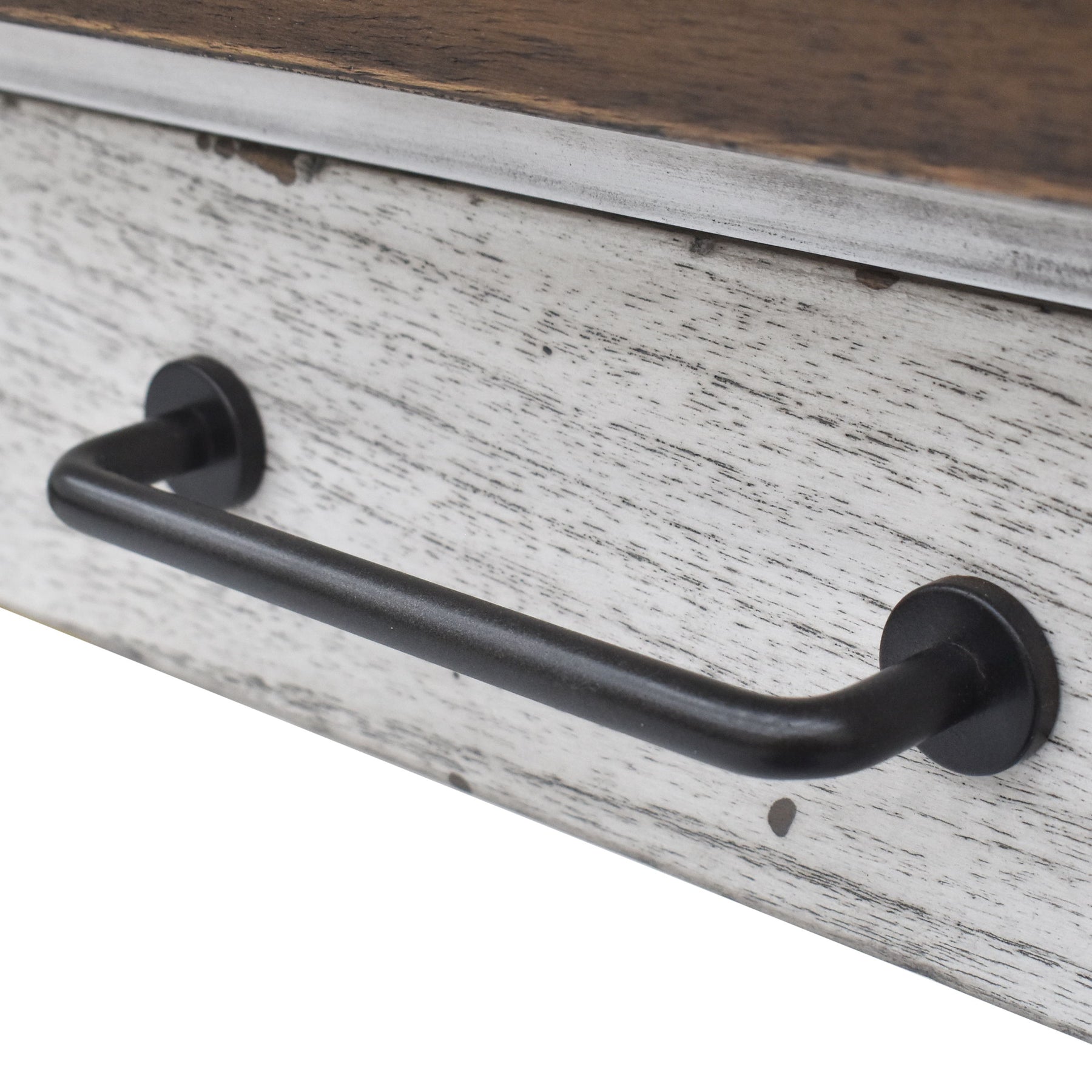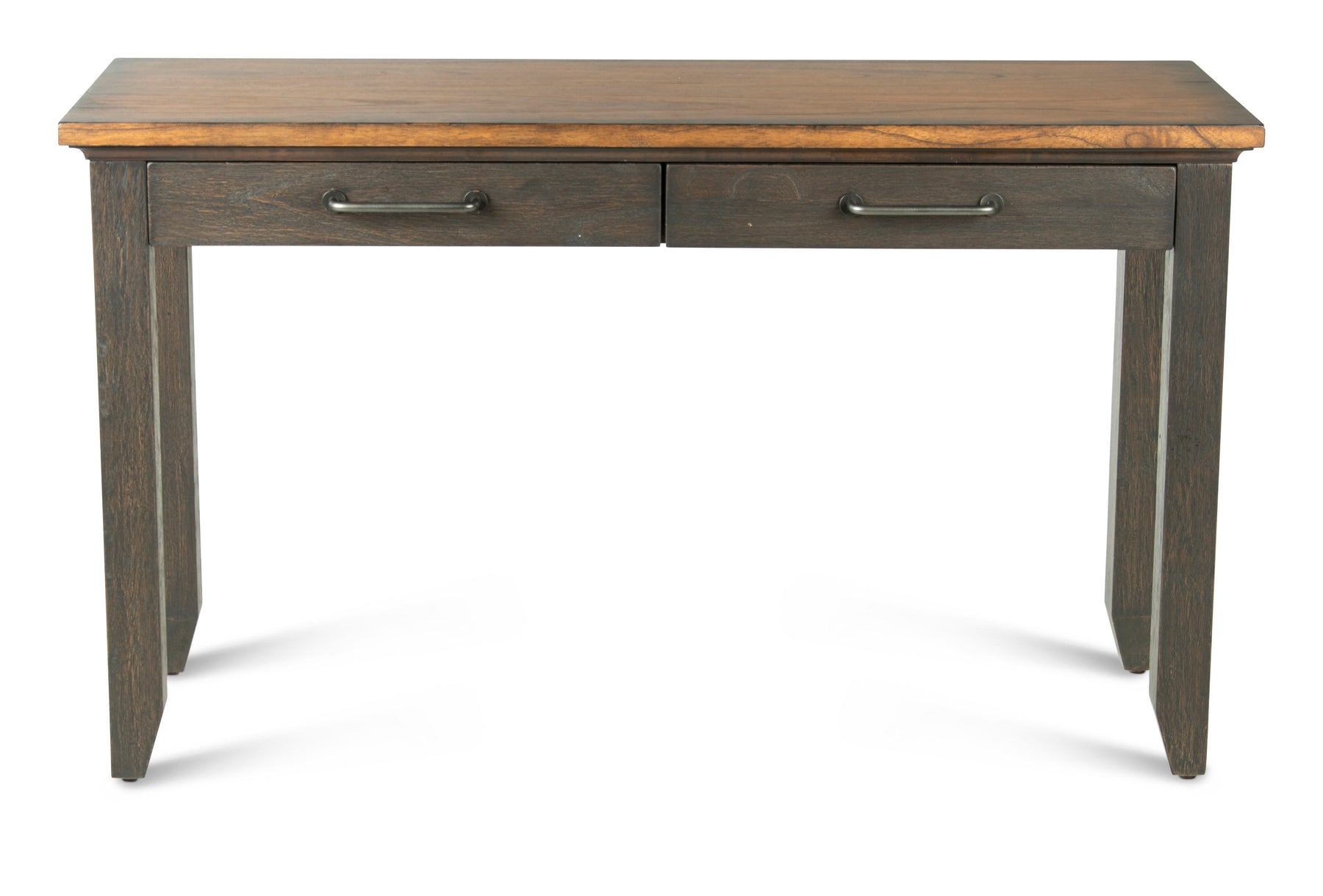 Transitional farmhouse styling with a modern edge, the Bear Creek Sofa Table is a versatile piece with many uses. Use behind a Sofa as a Sofa Table; as a hallway table for keys and other last minute items before school or work, as a desk or as an entertainment piece. The table warms up a room with its two-tone finish and includes two working drawers for convenient storage. Pair with the Bear Creek Brown Lift-Top Cocktail Table or End Table to complete the warm modern farmhouse look.