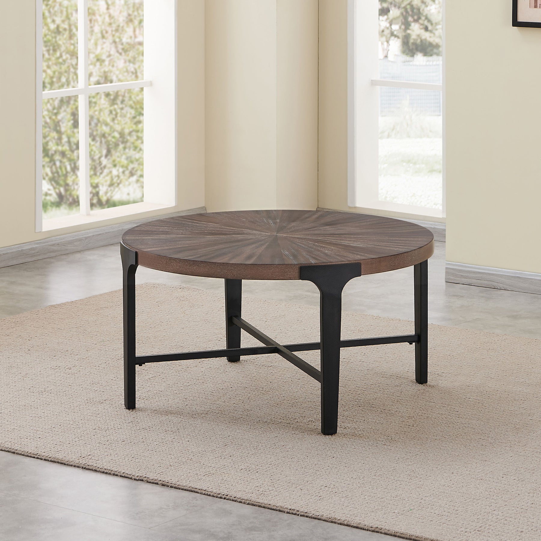 - Crafted of elm, Acacia and other veneers, engineered woods and black coated iron base