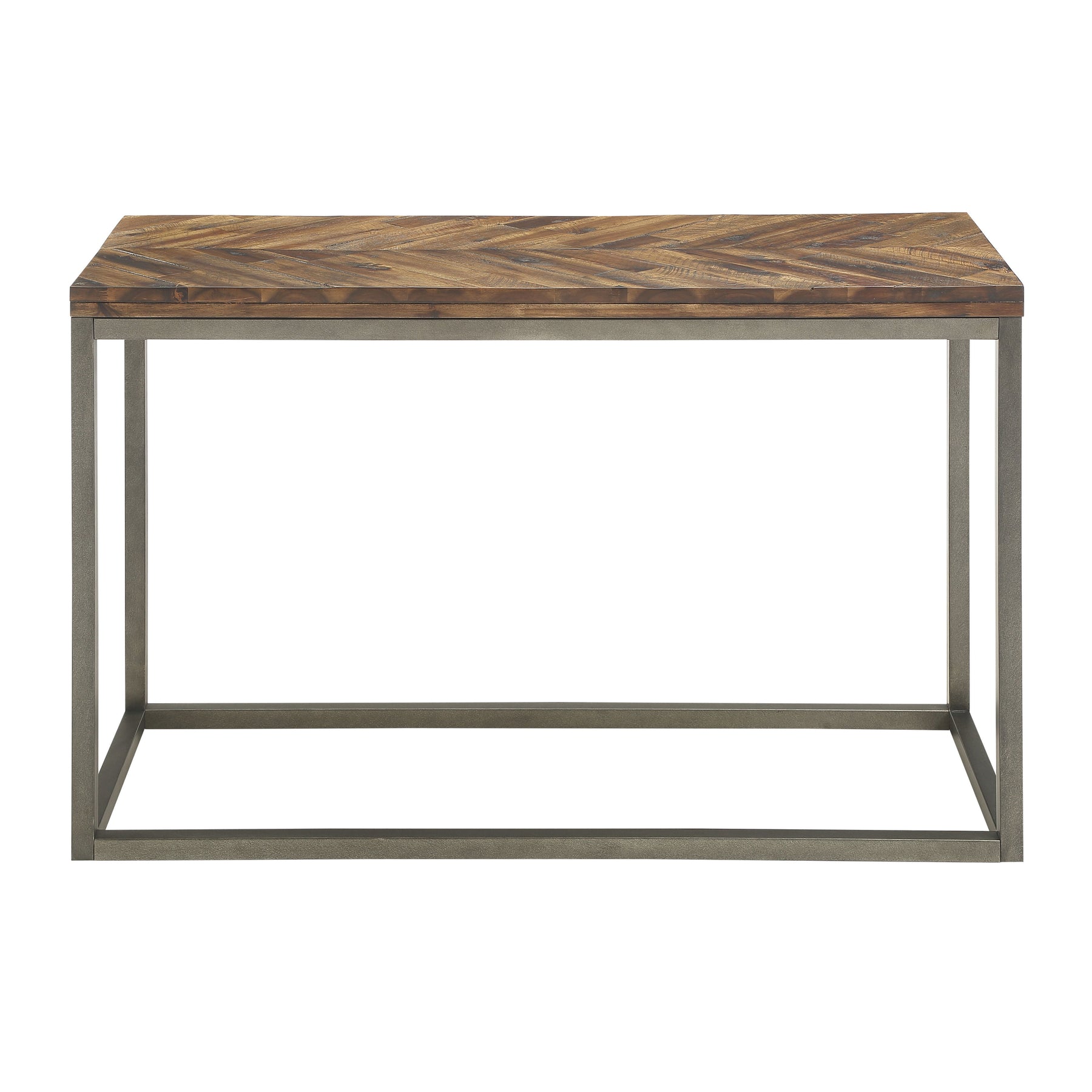 Lorenza presents rustic elegance in a set of occasional tables. This collection of cocktail, end and sofa table can be paired to fit your living space to deliver both functionality and style to any room. The fashion-forward sled style metal base pairs beautifully with the heavily distressed chevron-patterned smoky honey top to delivery a vintage feel comfortable with any casual style.