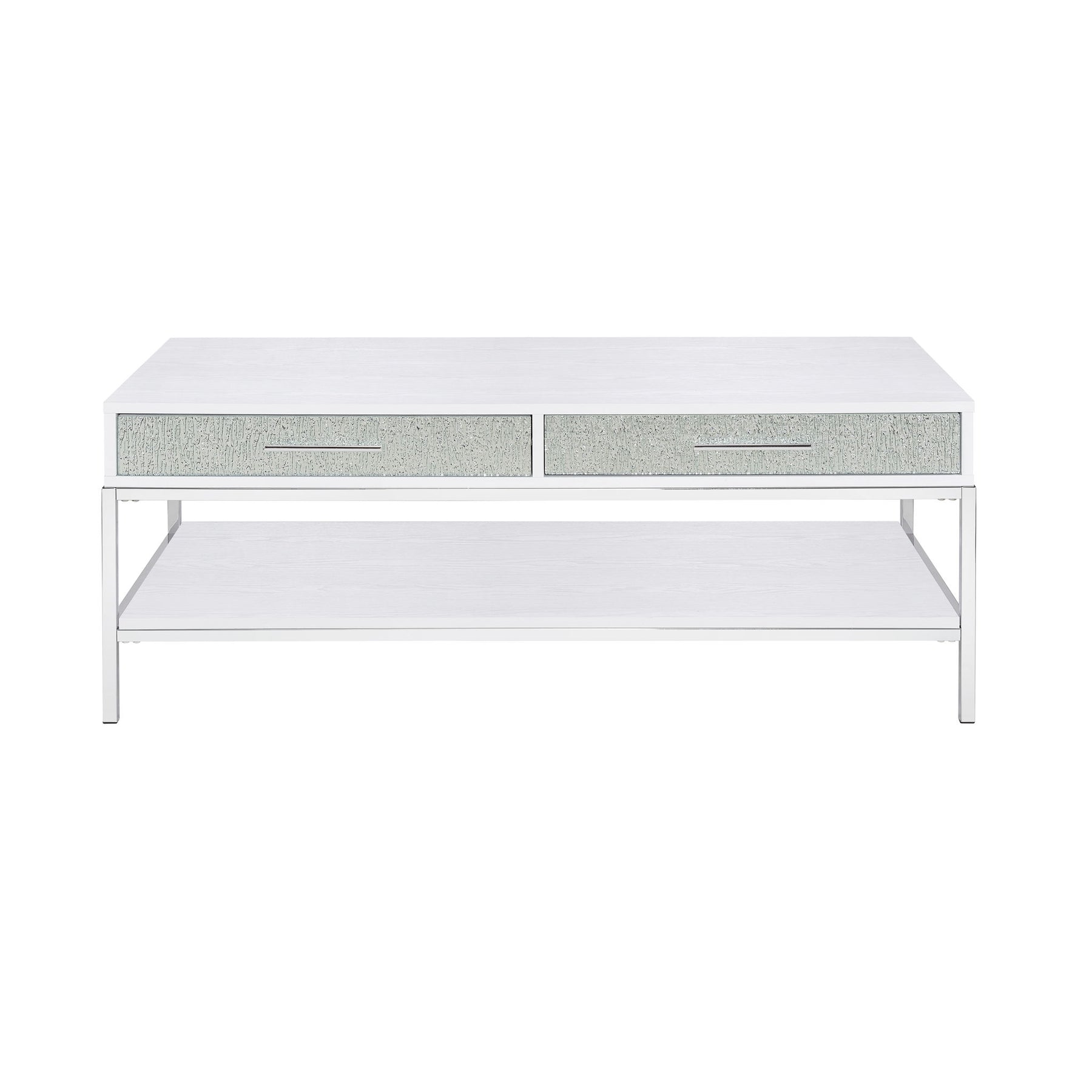 Contemporary glam styling in a beautiful centerpiece to a living room. Mirage combines a white finish with mirrored drawer fronts and chrome legs in a dazzling table that will sparkle with the available light. Function is also important and the Mirage Coffee Table has two drawers and a bottom shelf to help keep everything organized.