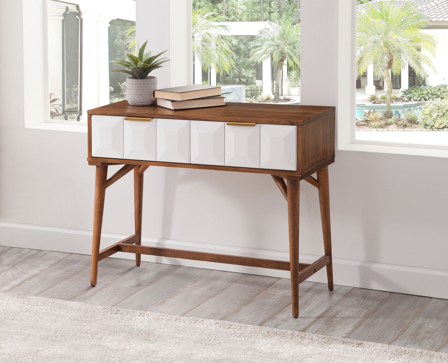 The best of mid-century modern design comes out in the Ginny Console Table. White pyramid fronts contrast beautifully with the burnished walnut color for a table that works great as a hall piece, entertainment unit or with a Ginny Nightstand in a bedroom. But not only is this the coolest looking Console Table you can find, but it is also built for service with quality construction throughout.