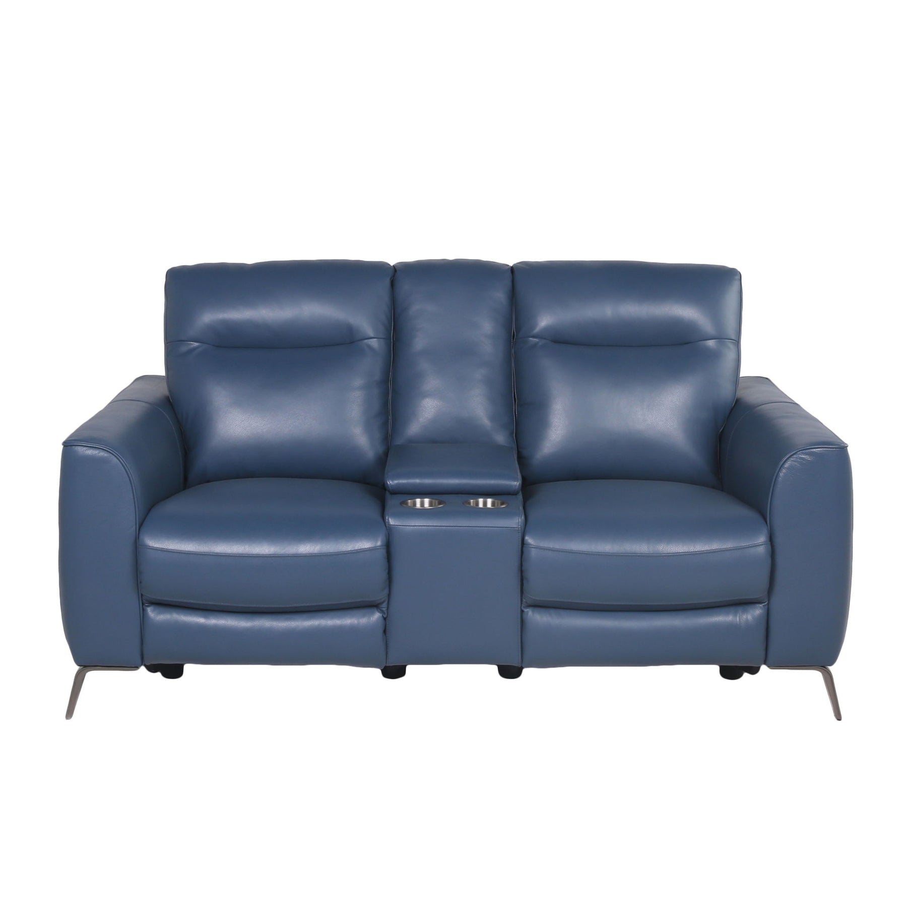 The Sansa Console Loveseat features all the bells and whistles you demand from a recliner without the look of motion furniture. This high-leg Console Loveseat is covered in top-grain leather and has a dual-hinge footrest that stows away under the Loveseat when not in use to give the look of a stationary Loveseat. This dual-power unit has a power footrest and power headrest to keep you in comfort and is covered in Ocean Blue top-grain leather on all touchable surfaces with a flaired chrome leg for extra panache.