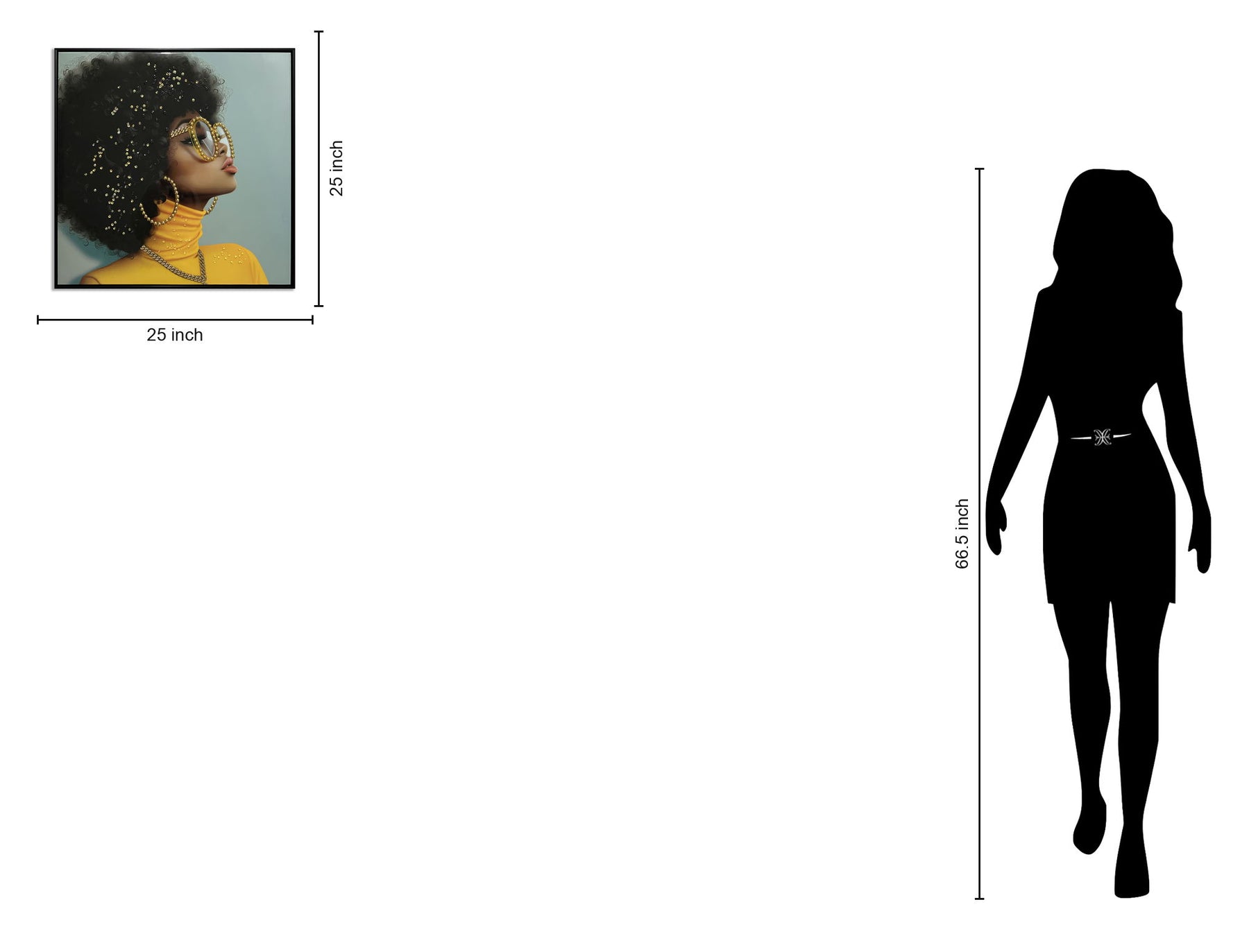 “Afro in Yellow” is a striking contemporary graphic art piece that celebrates bold style and individuality. Featuring a profile of a woman with a voluminous afro adorned with hand-applied sparkling accents, this artwork radiates confidence and glamour. The vibrant yellow turtleneck contrasts beautifully with the soft blue background, while the glossy canvas and textured rocks embedded in the frame add depth and tactile interest. Ready to hang and framed in sleek black polystyrene, this piece makes a powerful statement in living rooms, bedrooms, or offices. Each purchase supports a social cause, donating a meal to a hungry American child, making it both a meaningful and stylish addition to your space.
