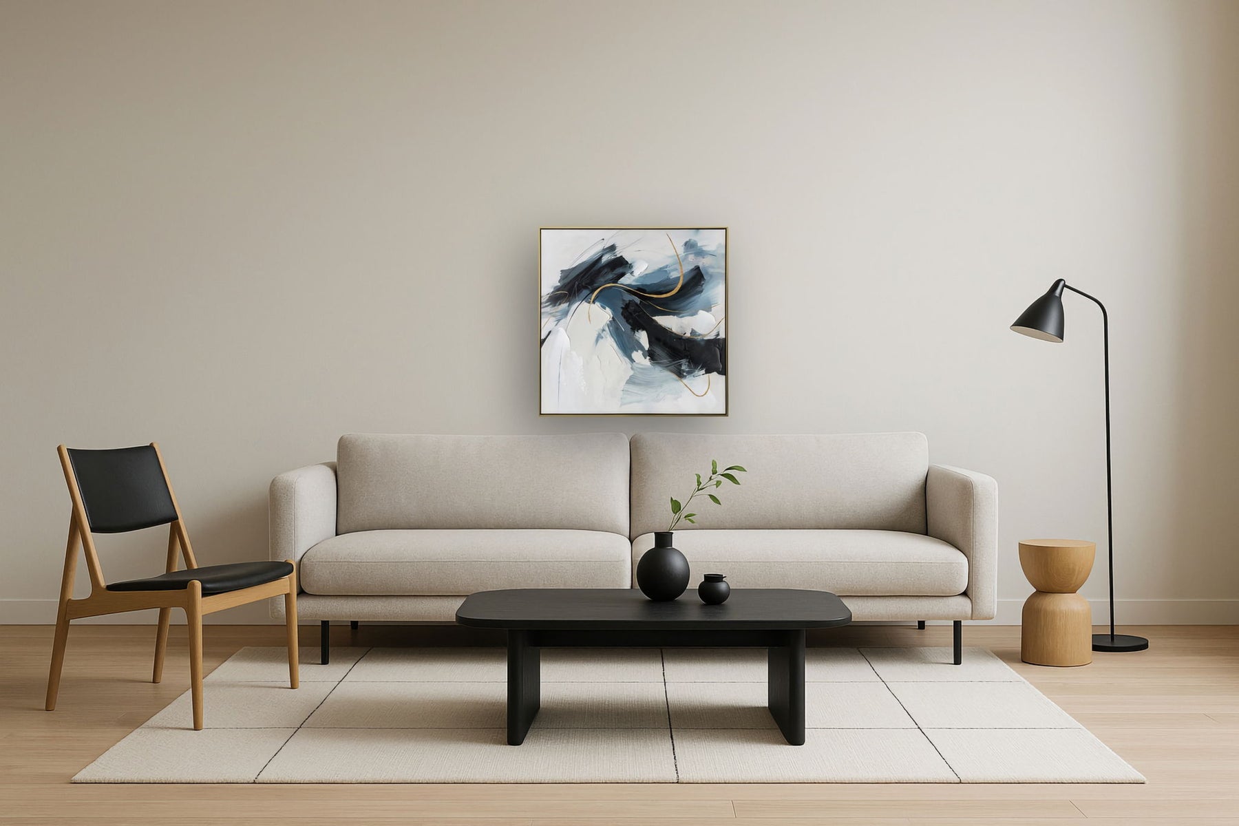 "Sable Motion Abstract" is a captivating hand-painted acrylic canvas that brings dynamic energy and sophisticated texture to your space. This contemporary piece features bold black and blue brushstrokes accented with elegant gold highlights, framed in a sleek gold polystyrene frame that enhances its visual impact. Ready to hang and crafted on durable canvas, it transforms any living room, office, or bedroom into a gallery-worthy environment while supporting a meaningful cause with every purchase.